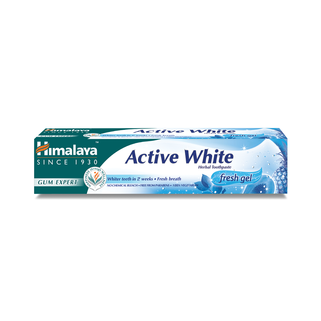 Η οδοντόκρεμα Himalaya Active White είναι μια επαναστατική φόρμουλα βασισμένη στην τεχνολογία των ενζύμων παπάγιας, ανανά, κανέλας, και γαρίφαλων, η οποία λευκαίνει τα δόντια μετά από 2 βδομάδες χρήσης χωρίς χημικά λευκαντικά. Η δραστική της σύνθεση σε μορφή γέλης, δίνει φρεσκάδα στην αναπνοή που διαρκεί μέχρι και 12 ώρες.